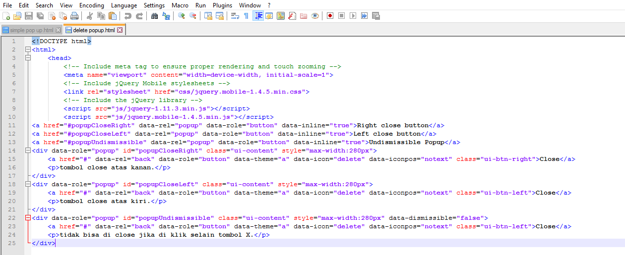 - SIMPLE POPUPS / BASIC POPUPSimple pop up merupakan pop up standard atau pop up basic dari suatu web. Untuk membuat popup, tambahkan atribut data-role="popup" ke sebuah div dengan popup konten, lalu buat link dengan set href ke id popup div dan tambahkan atribut data-rel="popup" untuk membuat framework membuka popup jika link di tap/klik.Berikut contoh coding dari simple popup :